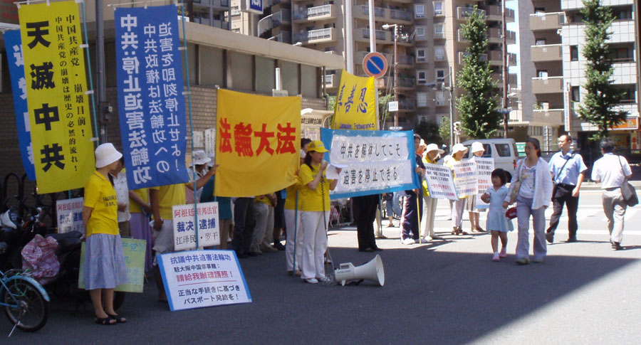 二零一零年七月二十日,大阪及周边的法轮功学员在中领馆前举行集会,揭露中共对法轮功的迫害,呼吁民众制止迫害。在集会现场,法轮功学员宣读了反迫害声明。声明中说,这场迫害之所以邪恶至极,是因为它不仅针对法轮功学员的“真善忍”信仰,也在试图泯灭全世界所有人的道德原则和精神价值。法轮功学员坚持不懈所做的是在帮助更多人了解真相。