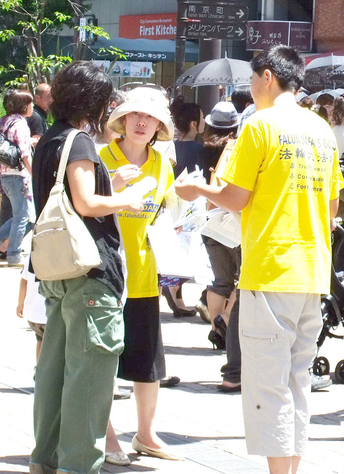 一对中年日本夫妇开始时对征集签名的学员摇着手说,跟我无关。但他们一边走一边看着学员手中的真相传单,突然那位太太停下脚步,表示迫害太严重了,并决定签名。随后夫妇俩都签了名,而且鼓励学员说:你们要加油啊!