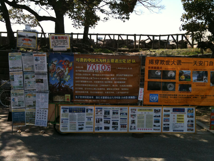 大阪城公园是西日本著名的旅游景点,每天都有大量的来自世界各地的游客,其中有很多是大陆观光团。因正值暑期,很多中国大陆年轻学生来此旅游。法轮功学员们就在景点面向中国游客讲真相,许多中国人在景点游玩的同时看到了法轮功的真相展板,听到了真相广播还接到了资料,在明白了法轮功学员的真诚善意之后,许多人退出了中共邪党相关组织。