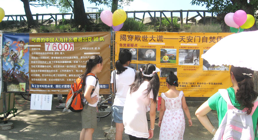 一对夫妇,妻子是中国人,丈夫是日本人,向学员要了许多真相资料,同时说他们看过《九评共产党》,对中共的残暴非常了解,内心里非常同情法轮功受迫害,但因自己的工作是涉及到中日两方的,对签名很有顾虑。学员给他们讲了真相后,夫妇俩最后鼓足勇气签下了自己的名字和住址。