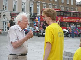 一位来自德国的旅游者,能说一口流利的中文,但他听信了中共诬陷法轮功的谎言,比如自焚、围攻中南海等,因而有很多误解。法轮功学员心平气和地为他讲解真相。