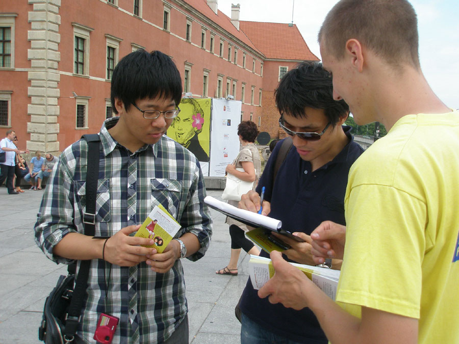 两位从中国大陆来波兰的中国人,原本看到法轮功字样就想躲开,但是法轮功学员微笑地请他们过来,希望他们能了解法轮功真相。在铁的事实面前,他们知道法轮功学员所说的都是实话,在很多具体问题上,他们提出了这样那样的疑问,法轮功学员都一一详细耐心地做了回答,最后,他们都愉快地做了“三退”(退出中共党、团、队),他们说:我们只在波兰逗留一天,没想到有这么大的收获,我们会告诉家人真相,也“三退”保平安。多谢了,多谢了,真谢谢了。