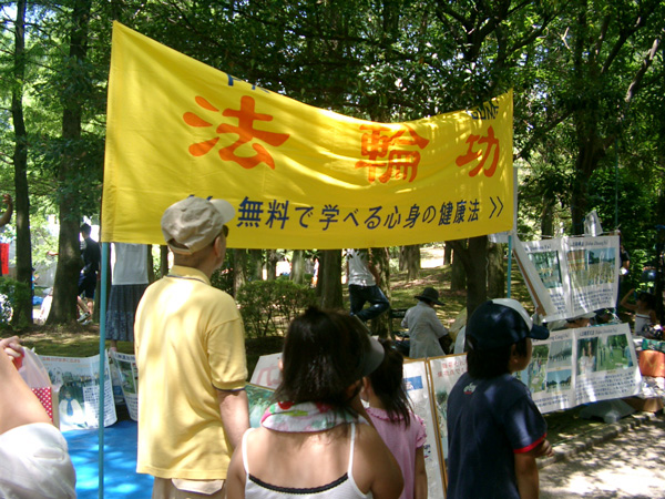 ![]() 法轮功学员在爱知县稻泽市夏季活动节上设置展位,介绍功法 |
