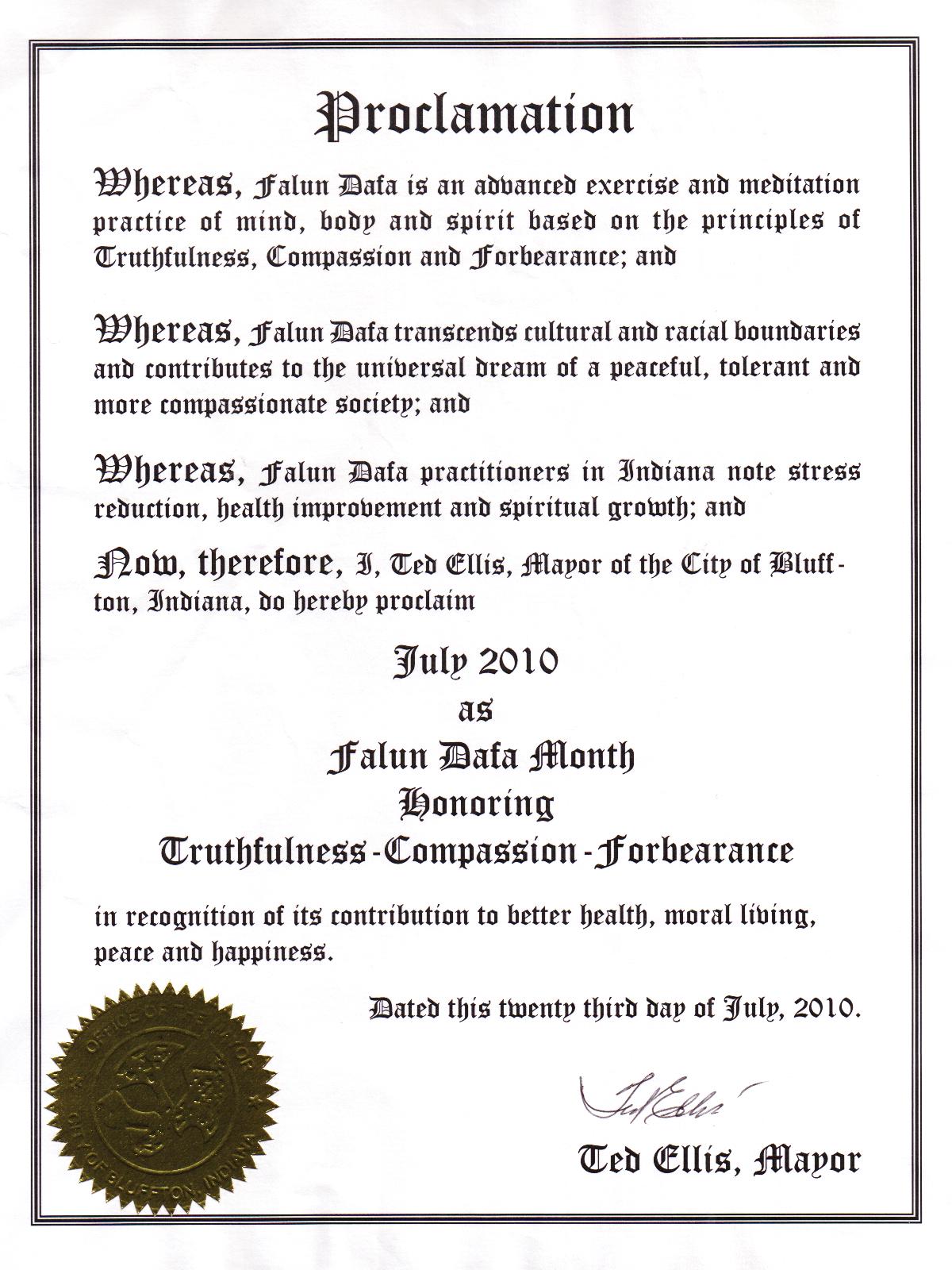 鉴此,我,百乐夫顿(Bluffton)市市长泰德•艾利斯(Ted Ellis),特此宣告二零一零年七月为印第安纳州百乐夫顿市“颂扬真、善、忍的法轮大法月”,以嘉奖法轮大法对增进健康、提高道德风尚的贡献。