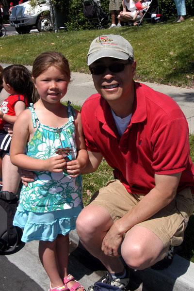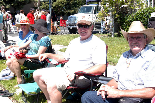 前来观看游行的人们有九十多岁的老人,也有刚刚“哇哇”落地不久的婴儿,有学童,也有青壮年男女。他们偕老带幼清早就拿着凳子,在游行队伍经过的道路两旁“扎营”,等着观看游行。他们为了表达对国家的热爱,将星条旗式样的布料做成帽子、衣服,戴在头上,穿在身上;还做成不同式样的装饰品。