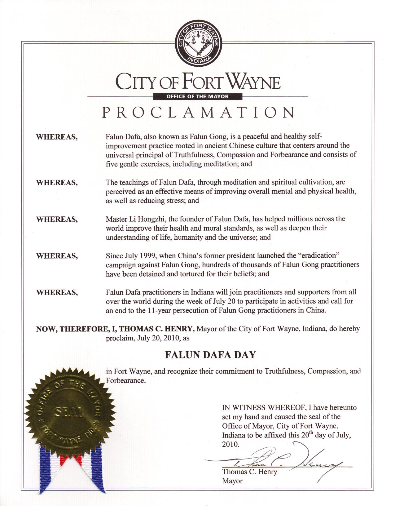 鉴此,我,印第安纳福特维恩市市长托马斯·亨利(Thomas C. Henry),特此宣告二零一零年七月二十日为印第安纳州福特维恩市法轮大法日,以嘉奖法轮大法修炼者对真、善、忍的信仰。
