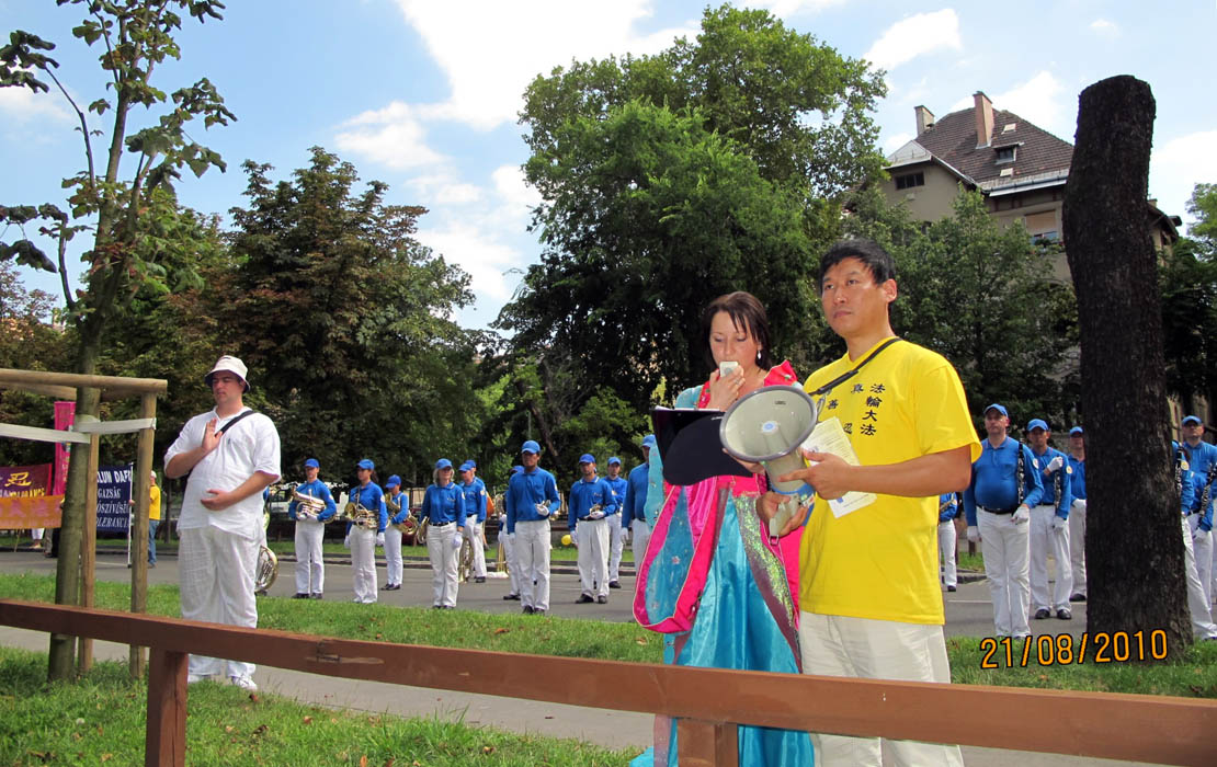 ![]() 奥地利法轮大法学会代表在中使馆前发言,谴责中共对法轮功的迫害。 |