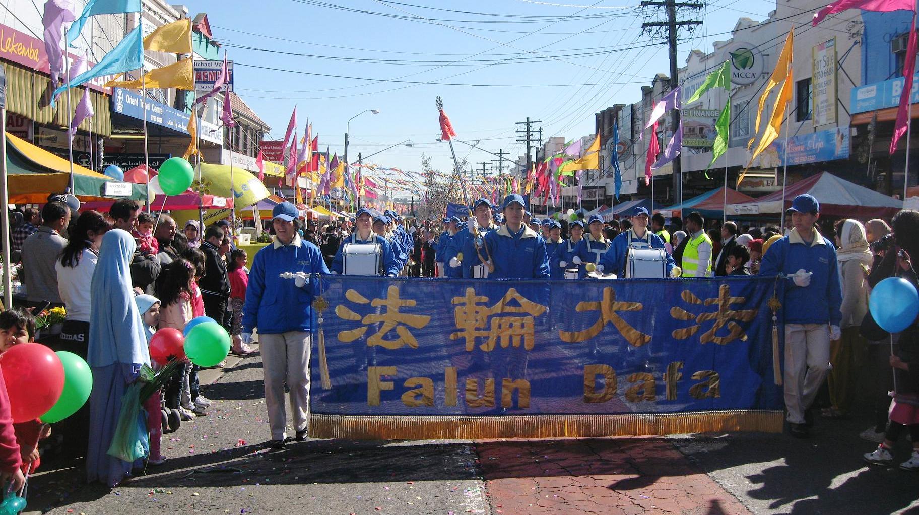 几天前的风风雨雨烟消云散,碧空如洗。近万名观众一大清早就在荷顿街上等着游行队伍的到来。当主席台宣布“现在是法轮功天国乐团登场”,天国乐团奏起了“法轮大法好”的音乐,队伍雄赳赳气昂昂,整齐地大踏步入场。人们被这雄壮的鼓号声和磅礴的气势惊呆了,一会儿才反应过来,然后拿起照相机和录像机不停地拍照,欢呼。有位华人妇女还上前来说:“谢谢你们法轮功!你们真的了不起!”。最后,人们不舍地目送着队伍走过,有的观众眼里还含着泪水。