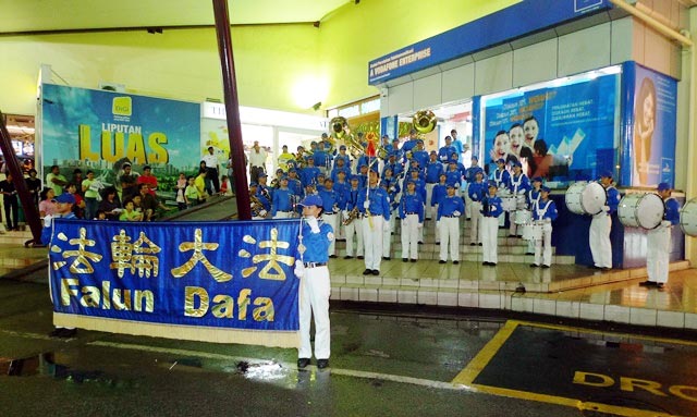 中午,天国乐团来到武吉占姆广场(Bukit Jambul Mall) 为今年的中秋佳节增添欢乐喜庆气氛。广场负责人还让学员现场播放法轮大法真相影片,演示功法。
