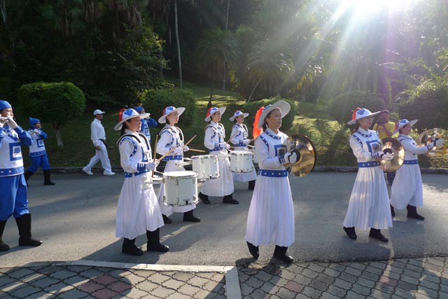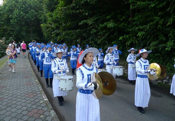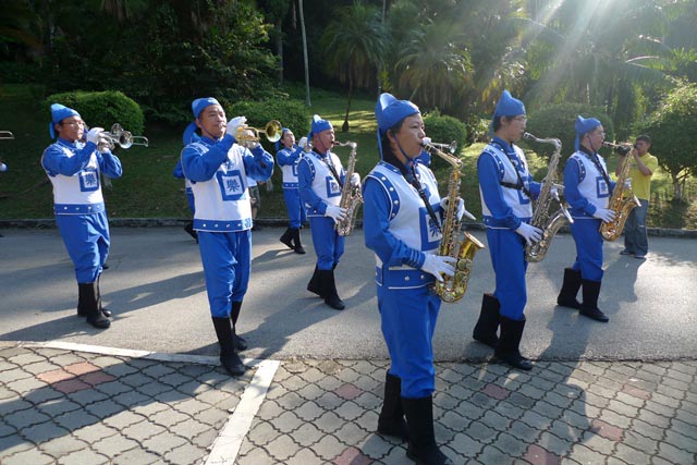 十九日天蒙蒙亮,天国乐团成员们穿着中国古装,来到槟城的名胜地之一植物公园(Botanical Garden)演奏。许多晨运的民众被天国乐团演奏所吸引,纷纷取阅资料了解法轮大法。