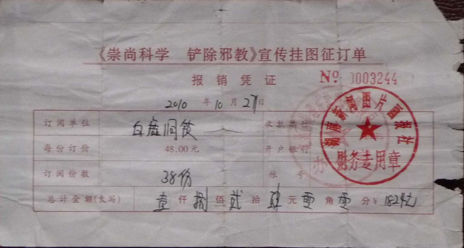 陈丙娥老人绝食抗议无理迫害,那些中共邪党人员们问为什么不吃饭?她说:“我要回家吃,放我回去。”他们就威逼利诱她写保证不炼了,就放她回家。她坚决不写。他们就向其女儿勒索一千八百二十四元人民币,给了她女儿一张《崇尚科学 铲除邪教》宣传挂图征订单的报销凭证当发票(见下图),订阅单位是白鹿洞镇,收款单位一栏盖了二颗章,分别是“北湖区处理法轮功问题领导小组”办公室、“湖南新闻图片画报社”财务专用章。