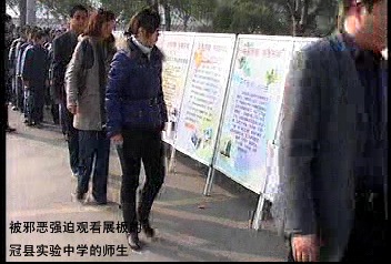 为了继续营造迫害氛围,冠县“六一零”于二零一一年五月底组织全县范围内的邪恶宣传,颠倒黑白诬陷法轮功。五月二十七日上午,公安局副局长王勇和“六一零办公室”副主任石学增在清泉中学教学楼前为此活动打气,他们胁迫两千多名在校中学生参观诬陷法轮功的展板并强制在支持邪党迫害法轮功的征签布上签字。王勇叫嚣要让这个活动进乡村、进社区、进企业并长期维持下去。