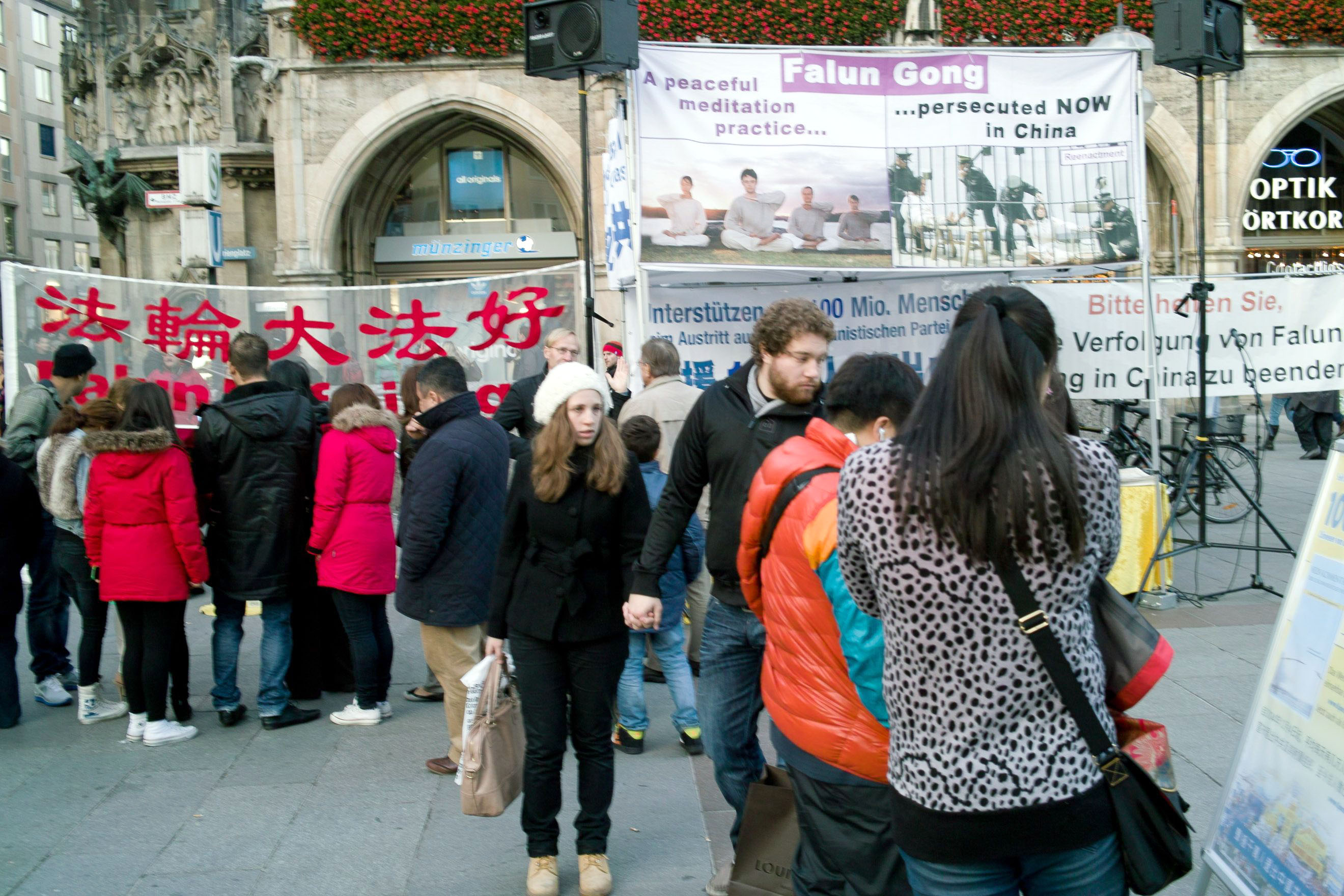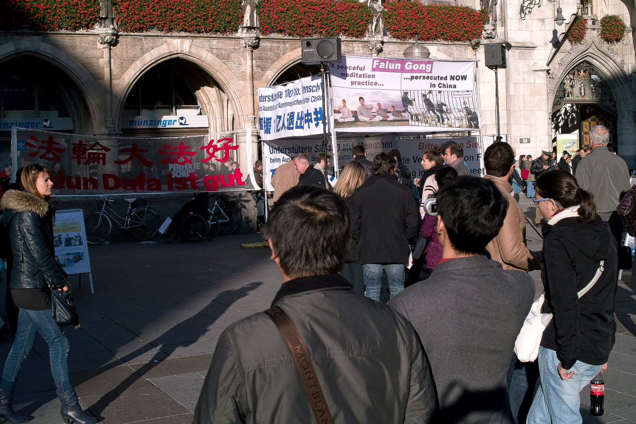 二零一一年十月二十二日,德国慕尼黑的法轮功学员在市中心玛琳广场(Marienplatz)上举办声援一亿四百万中国民众退出中共的活动,揭露中共邪党的罪行,告诉人们法轮功真相,规劝中国人退出邪党及其组织。