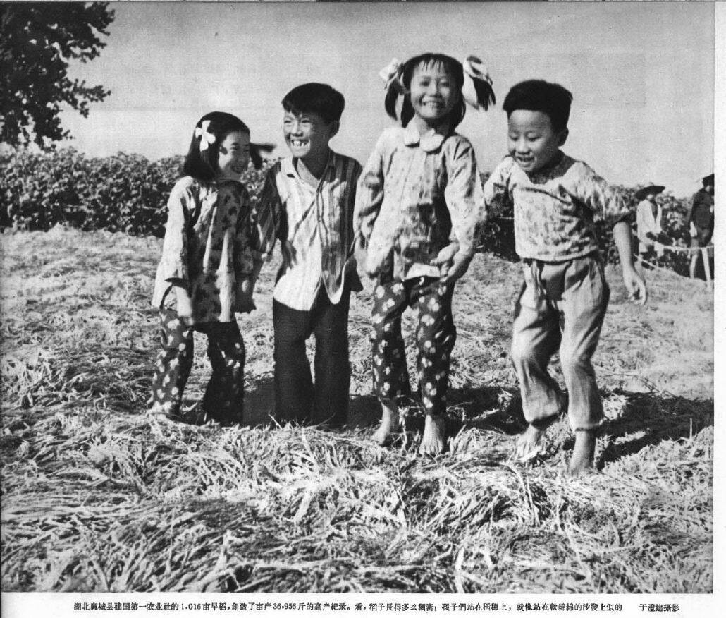 在新华社和人民日报你追我赶的谎言竞赛中,让人印象深刻的是下面的两张照片。照片里的稻子是如此的稠密,小孩坐在上面或站在上面,稻子居然不倒,按照中共媒体的说法,“如同软绵绵的沙发”。