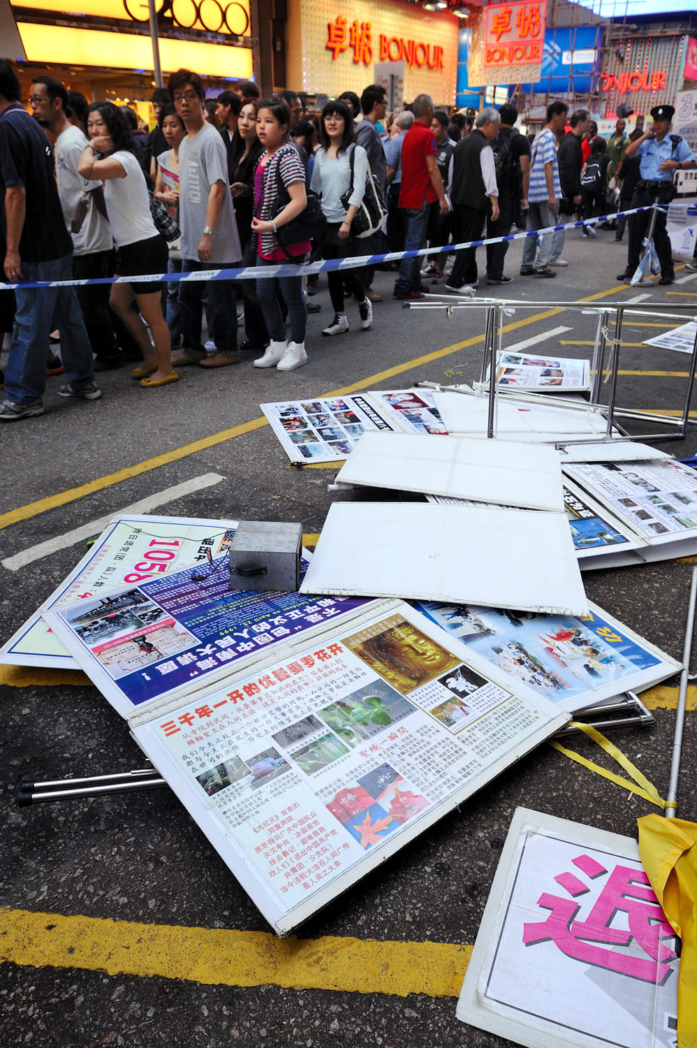下午三时左右,又一名男子来到真相点,大肆破坏横幅和展板,把铁架、手推车、展板通通推倒,将资料撒落一地。警察据报后将凶徒拘捕,查问他为何搞破坏。此人自称是住在天水围的泰国华侨,打着手势用广东话说:“我就是为了一点利益!”