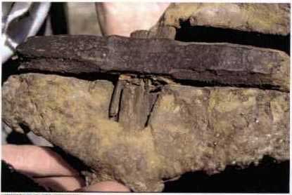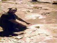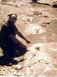 在美国得克萨斯州 Glen Rose的拉克西河的河床中发现有生活在白垩纪的恐龙的脚印,考古学家们吃惊地在恐龙脚印化石旁十八英寸半的地方,同时发现有12具人的脚印化石,甚至有一个人的脚印迭盖在一个三指恐龙脚印上。把化石从中间切开,发现脚印下的截面有压缩的痕迹,这是仿制品无法做到的,显然不是假冒的。另外在附近同一岩层还发现人的手指化石和一件人造铁锤,有一截手柄还紧紧留在铁锤的头上。这个铁锤的头部含有96.6%的铁,0.74%的硫和2.6%的氯。这是一种非常奇异的合金。现在都不可能造出这种氯和铁化合的金属来。一截残留的手柄已经变成煤。要想在短时间内变成煤,整个地层要有相当的压力,还要产生一定的热量才行。如果锤子是掉在石缝中的,由于压力和温度不够,就不存在使手柄煤化的过程。这说明岩层在变硬、固化的时候,锤子就在那儿了。发现人造工具的岩层和恐龙足迹所在岩层是一致的,而其它岩层都没有恐龙足印和人造工具。这说明人类和恐龙的确曾生活在同一时代。