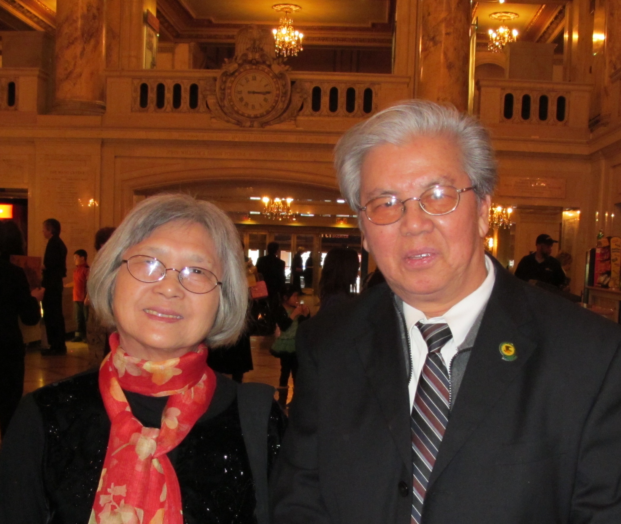 ![]() 华人艺术领袖周文熙(左)与黄镜明欣赏神韵晚会后表示:神韵给人光明与希望 |