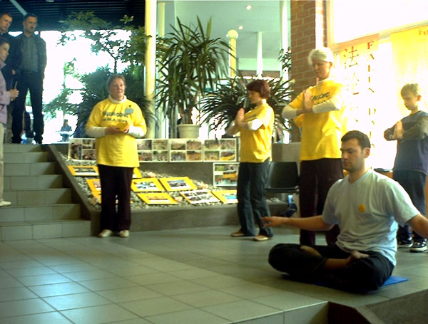 法轮功学员的功法演示使环境变得祥和,人们兴趣盎然地当场学功。