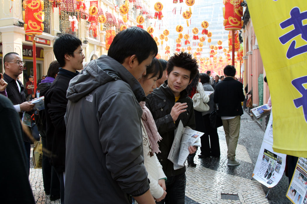 【明慧网二零一一年二月五日】二零一一年二月四日,正是中国新年大年初二,澳门法轮功学员利用假期除了在每天坚持的景点上讲真相劝三退(退出中共党、团、队)外,又加开一个真相点在市中心最热闹的地方──议事亭前地。在两个景点上,特别是从中国大陆来的游客川流不息,人们在参观景点的同时,驻足观看图片,了解法轮功在中国大陆无辜遭受迫害的真相。在退党义工的帮助下,不少人办了三退。