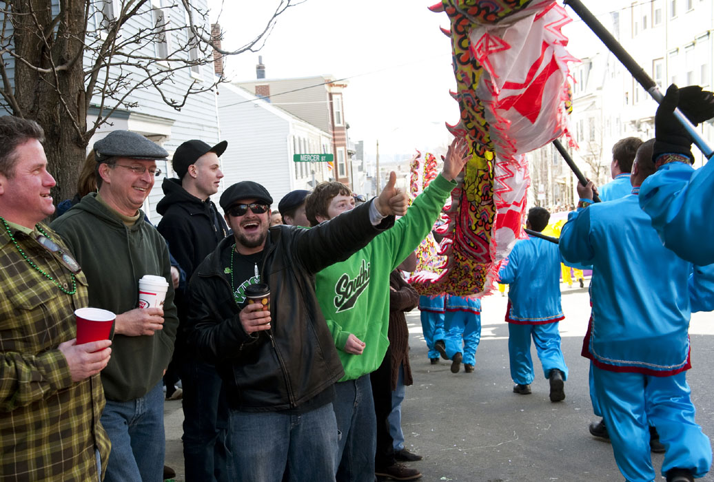 波士顿圣派翠克日游行是全美第二大的圣派翠克日游行,许多华裔也争相前往观赏。刚由大陆来美求学的卢小姐,看到天国乐团的团员们英姿飒爽,在海外为华人争光,非常激动。