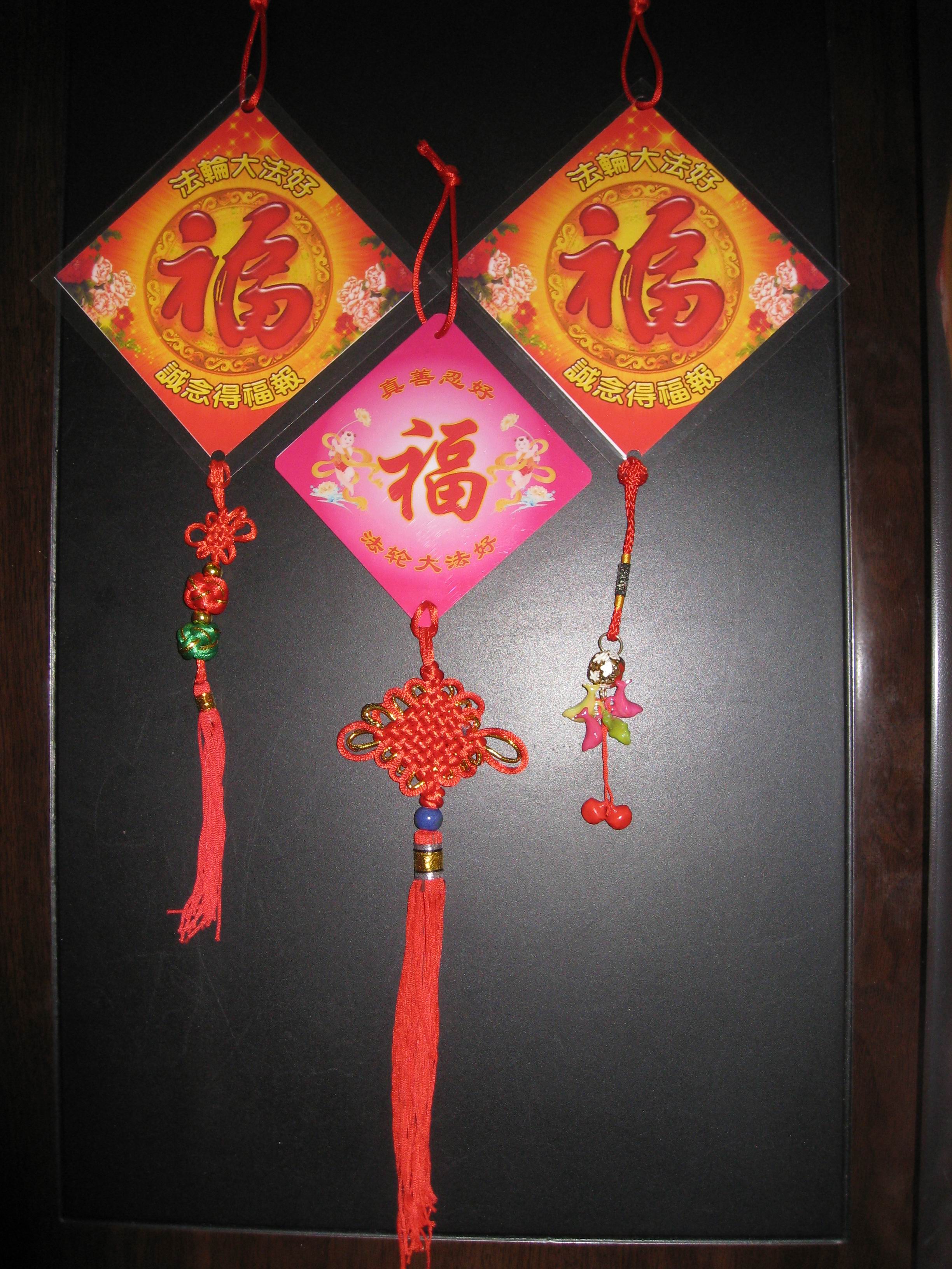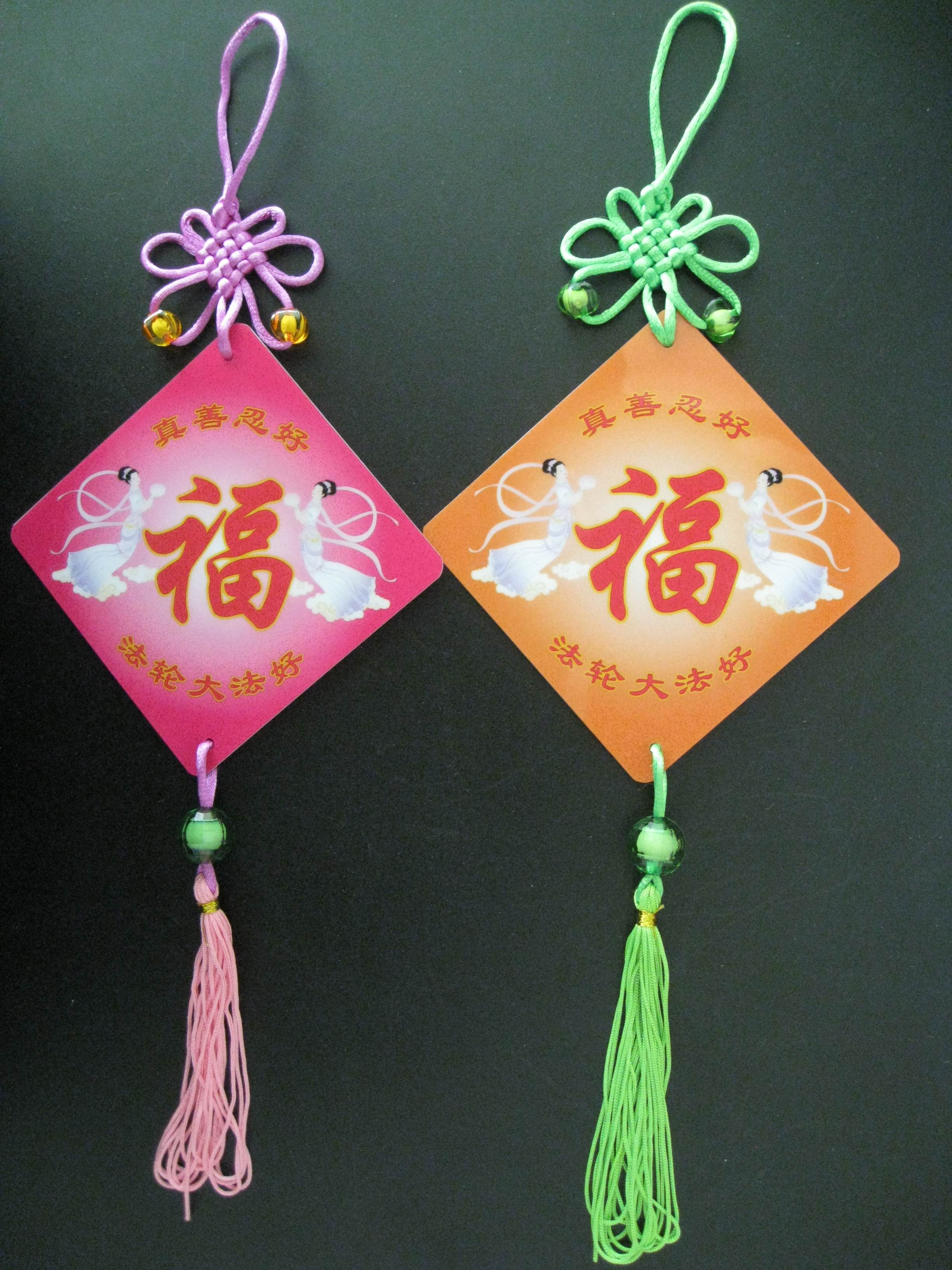 因此,我建议大陆有这方面能力和条件和同修,可以自己制作一些小的精美的民间手工艺品,上面或写或印或绣上大法真相短语,同真相资料(可搭配《九评》、小册子、光盘)一起作为礼物发给世人,也可在世人三退后送给其一份,建议最好用有印花的手提塑料袋装入。如下图,有手艺的同修可自制真相项链或中国结,也可批发现成的中国结,装饰在真相卡片上,制成真相挂饰。这只是抛砖引玉。