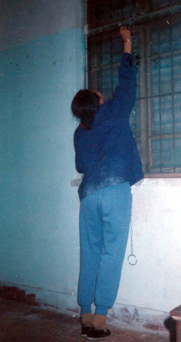 法轮功学员甲:那年过完年,我被关进了暴力洗脑班,是踏着雪水进洗脑班的,鞋子湿了,袜子也湿透了,趁警察检查行李的时候,我坐下来,用冰冷的手抓抓冰冷的脚趾,工作犯霍莹便厉声呵斥说我在打坐,野蛮的将我的手拿开,残酷的转化开始了。门窗紧闭,每天罚站,开始的一个星期,由于我高血压、心脏病,曾晕过去一次,所以每天晚上九点以后我还能睡上一觉,以后的日子不准睡觉,夹控犯轮班睡。我困了晕倒在地上,扯起来,不起来就往身上泼冷水,记得那年三月五号还下着鹅毛大雪,我的衣服从里到外被泼得透湿,连符号(监狱给每个犯人的标志)都浸湿了,有四十天二十四小时不准上床睡觉,那时我眼前出现了许多幻觉,看到有穿长袍的人,看到我丈夫……人还有隐隐约约的一点意识,知道自己在被迫害。