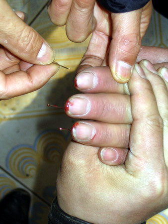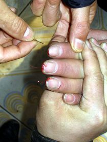 外祖母不用药,只用一根做活用的针,针上引一根线,搓成疙瘩,就用它扎针。如新生儿七天风,八天扔,扎一次就好;白喉:把针绑在筷子上,扎完很快就好。