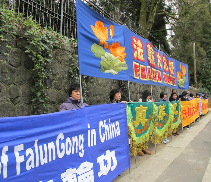 法轮功学员在温哥华中领馆前二十四小时抗议中共迫害法轮功,始于二零零一年八月二十日。