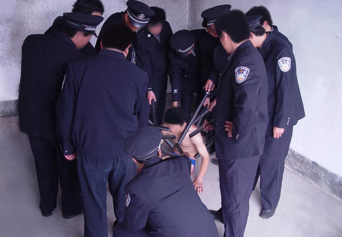 ![]() 酷刑演示:长时间铐在床架子上,只能站立 |