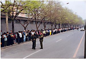 一九九九年四月二十五日,午饭时间,有些学员是带了午饭来上访的,须寅还看到一些学员去附近的食品店和餐馆买东西,学员们都自觉地排了很长的队,包子卖完了,店主再去拿的时候,也没有人等得不耐烦,更没有人插队。但也有的学员一天既没吃也没喝,须寅就是这样。他来的时候没带吃的和水,他一直站在街口,也不知道厕所在哪里,即使有厕所,可能也会有很多人排队吧,他想。