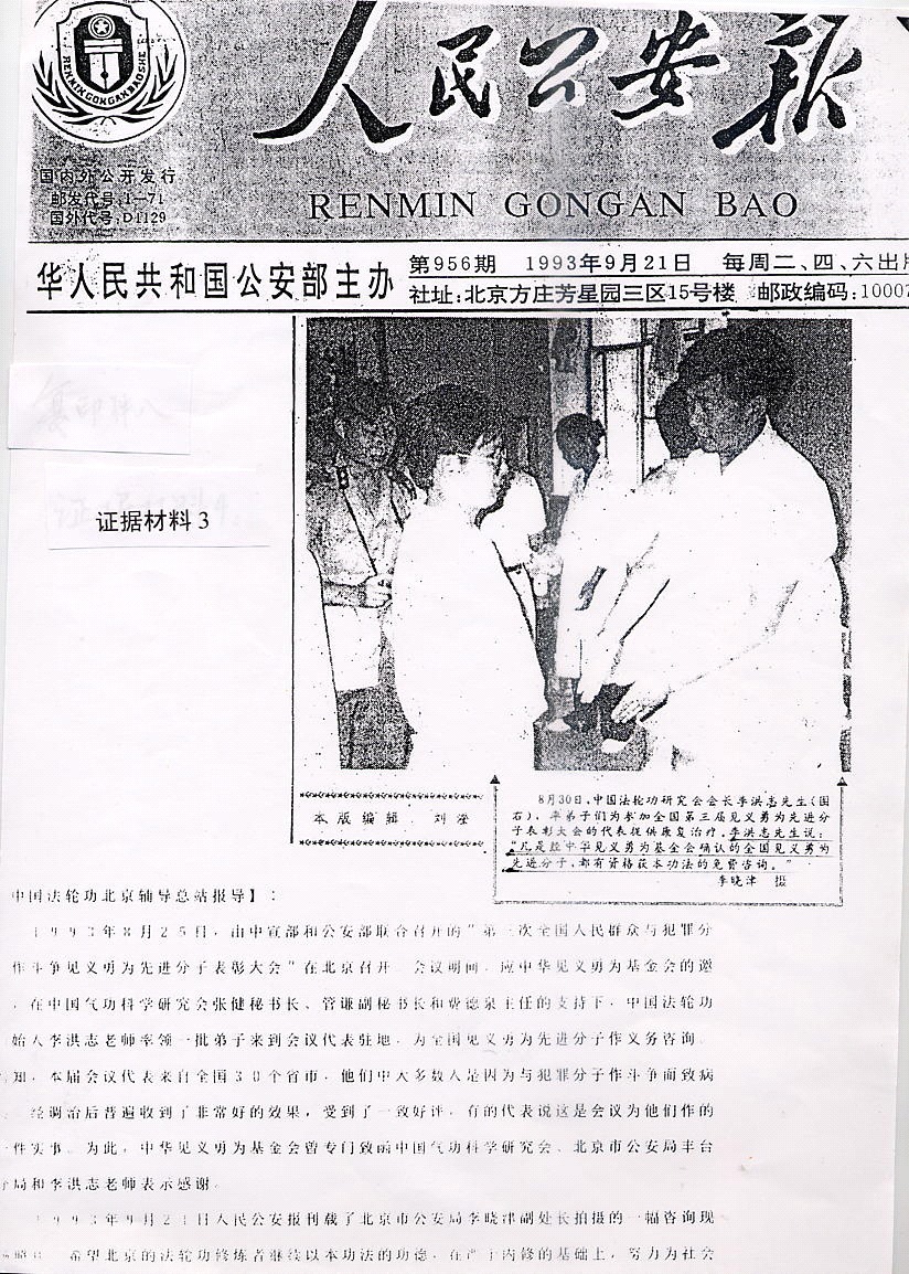 一九九三年八月三十一日,中国公安部所属中华见义勇为基金会致信中国气功科学研究会,感谢李洪志先生为全国第三届见义勇为先进分子表彰大会代表免费提供康复治疗。一九九三年九月二十一日,中国公安部主办的《人民公安报》刊登报导《法轮功为见义勇为先进分子提供康复治疗》,称公安部见义勇为先进分子“经调治后普遍收到了非常好的效果”。一九九三年十二月二十七日,李洪志先生获中国公安部所属中华见义勇为基金会荣誉证书。