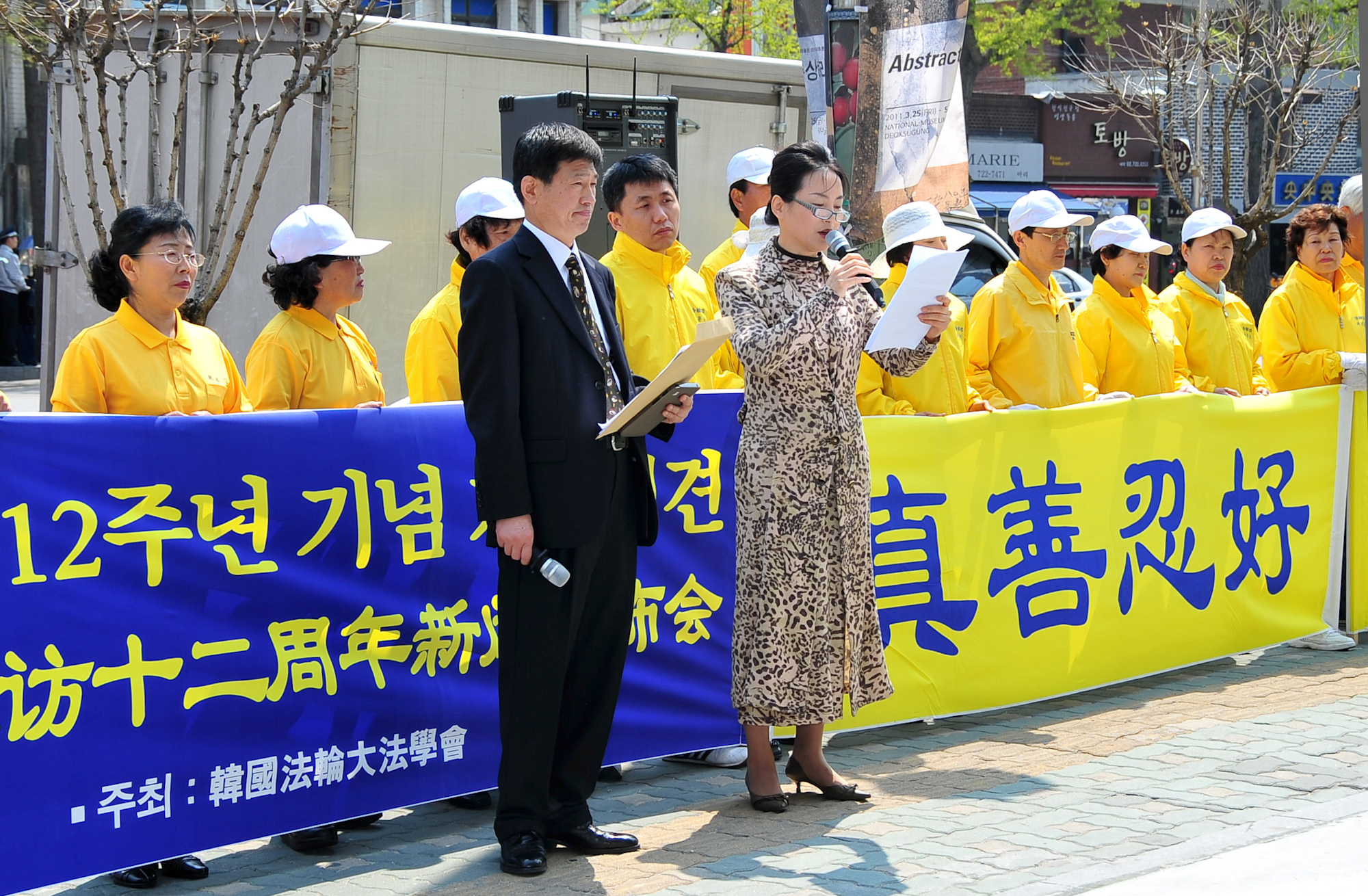 二零一一年四月二十五日,韩国法轮大法学会在中共驻韩大使馆前举行新闻发布会,纪念“四二五和平大上访”十二周年。