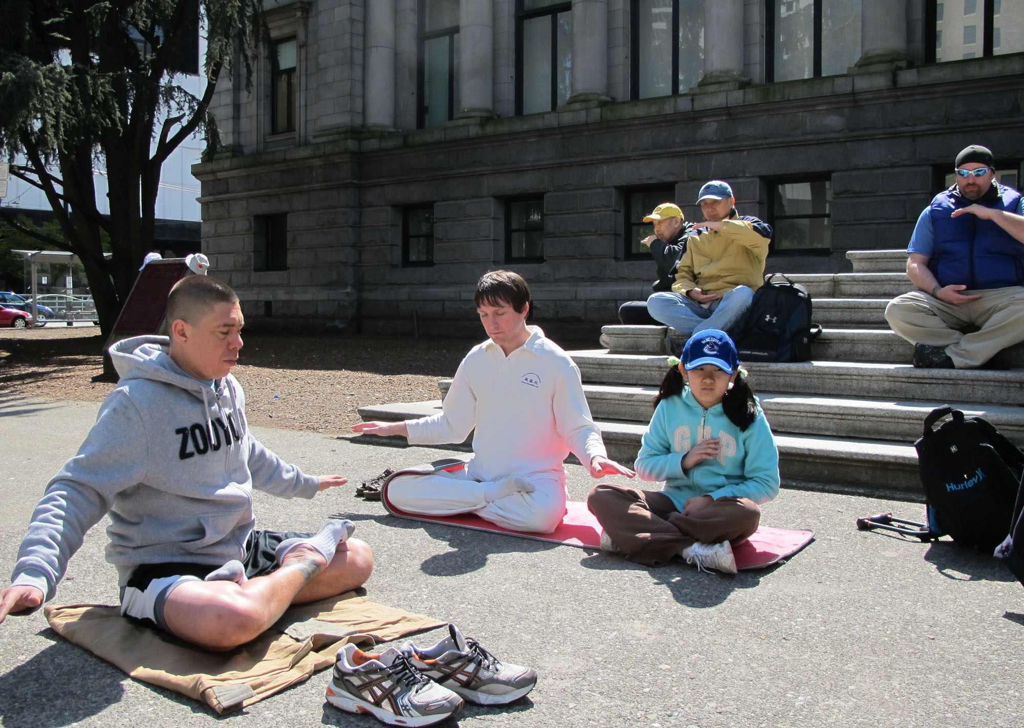 二零一一年四月二十三日下午,温哥华学员来到市中心艺术馆北门广场集体炼功。第五套功法的音乐在市中心回荡,宁静的打坐场面,吸引许多路过行人驻足观看,摄像。面对街道的闪闪发光的“法轮大法好”大横幅特别醒目,横幅两边是真相图片展,告诉人们大法的美好和大法弟子在中国受到的残酷迫害。有些人看得很仔细,也有人边看边摄影。