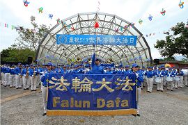![]() 台北法轮功学员在士林官邸的草坪上排出“513”,以庆祝“五一三世界法轮大法日”,并恭祝师尊生日快乐。 |