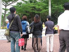 ![]() 台北法轮功学员在士林官邸拉横幅讲清真相,路过的旅客高喊“法轮大法好!” |