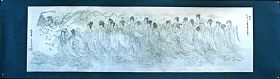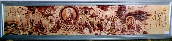 作者在创作这张木板烙画前还没有成熟的完整的构图,创作时,先在画板中间烙画上主尊的法像,然后烙画两侧人物,其间每位罗汉、菩萨神态各异,整体构图很圆满。画展期间,有人看到这幅作品,说画面布局很巧,两侧各有九位菩萨罗汉,正应了佛家的最大数字。作者听后,再看自己的画作确是如此,作画时自己本没有这种构想。冥冥之中自有安排,参观者感慨为神来之笔。