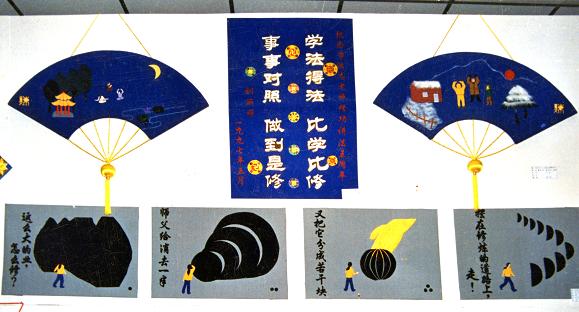 迫害后,中共抄走了有关大法的书籍、音像资料等,还有书画展的作品和照片。恶人把这些作品摆到警察学校,作为迫害有理的“证据”让世人看。其中就把这组布贴画放在第一排,看看法轮功有多“迷信”。邪党推崇无神论,否定神佛的真实存在。