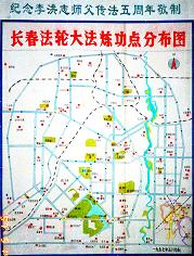 书画展对大法洪传的作用真是不可思量的。参观的常人,有的当时走进大法,有的陆续结缘。过去有不精進的学员受到了触动,勇猛精進;对法理持怀疑态度的,坚定了信念;观看展出的人都受到了不同程度的鼓舞。下图是同修绘制的长春法轮大法炼功点分布图,反映出九七年大法在长春洪传的形势,已经是遍地开花,无处不见了。九九年中共迫害时,统计长春市修炼法轮大法的学员是八万多人(实际人数远远超过这个数字)。