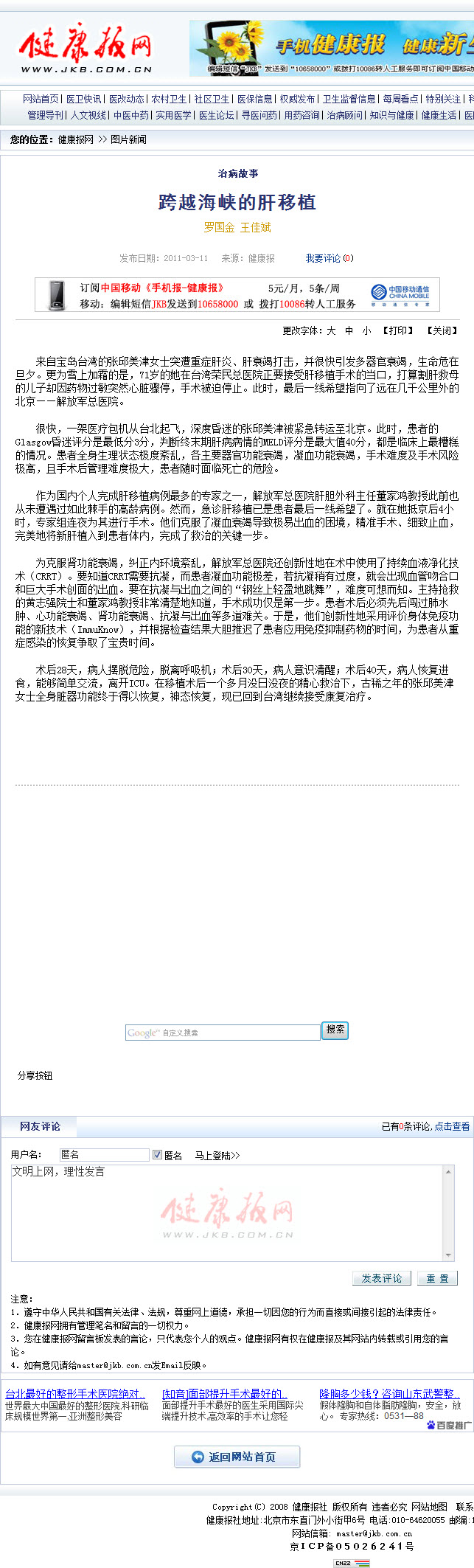 ![]() 《健康报》网:《跨越海峡的肝移植》 |
