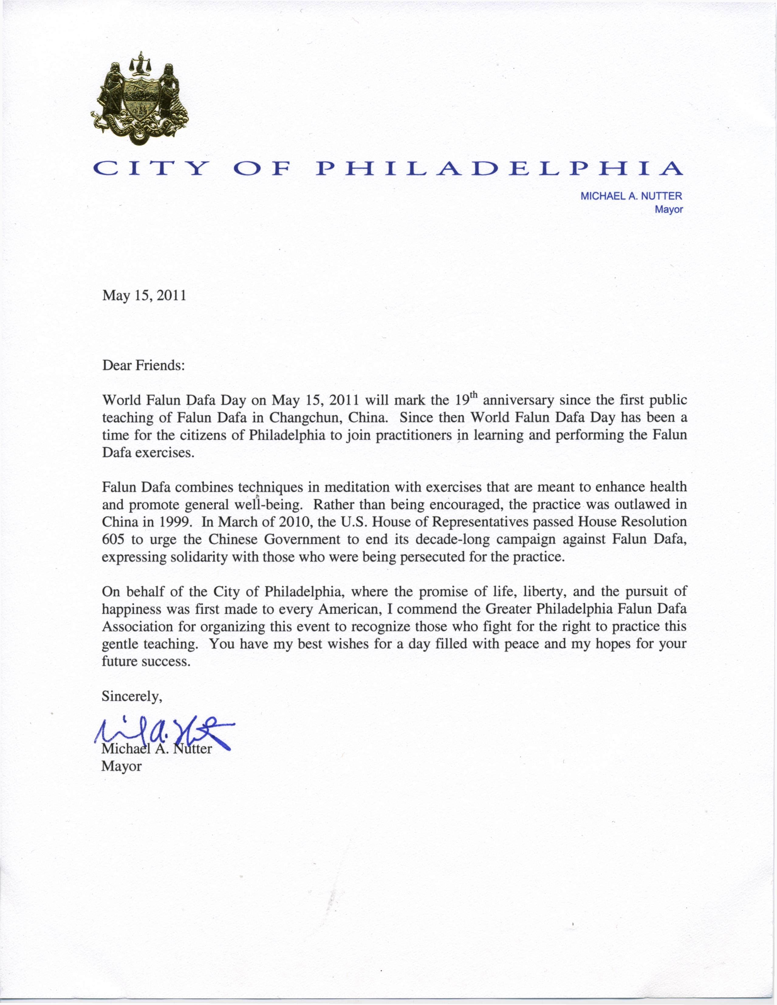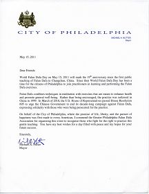 【明慧网二零一一年五月十五日】美国费城市长迈克•纳特(Michael A Nutter)致信大费城法轮大法学会,祝贺世界法轮大法日。