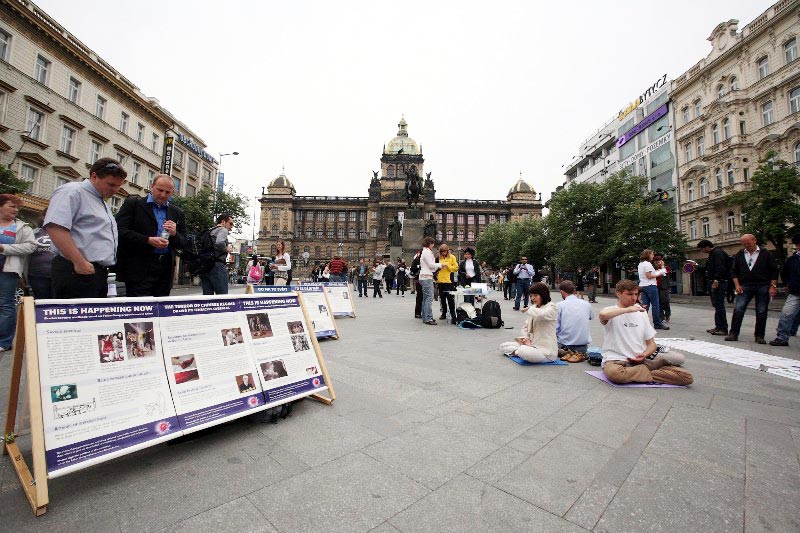 ![]() 捷克学员在瓦茨拉夫广场演示法轮功功法,并摆放真相图片展。 |