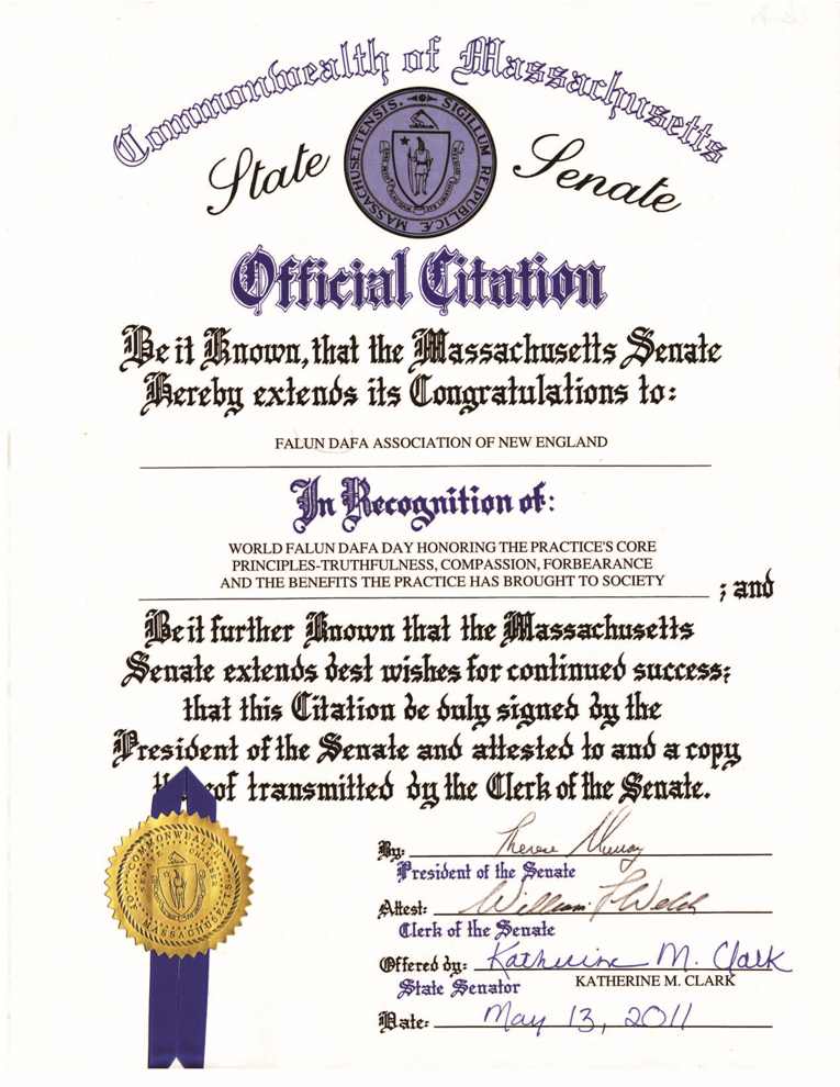 麻萨诸塞州众议院向新英格兰法轮大法学会致以最衷心的祝愿!