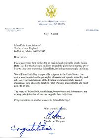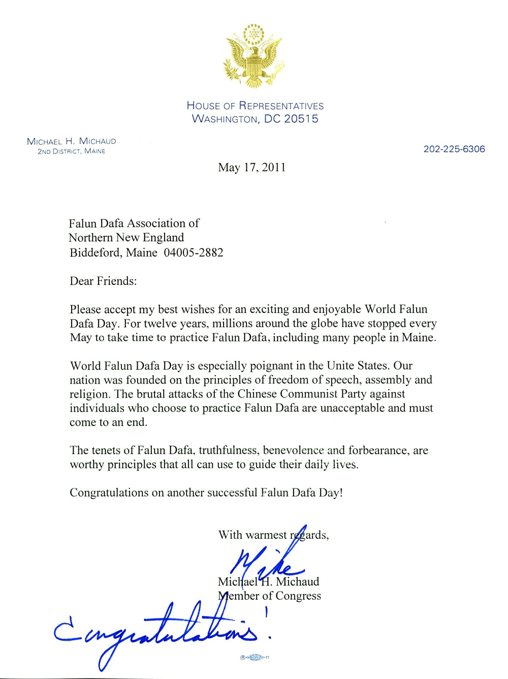 【明慧网二零一一年五月二十一日】美国缅因州第二选区国会议员麦克·米乔德(Michael H. Michaud)致信新英格兰法轮大法学会,祝贺世界法轮大法日。