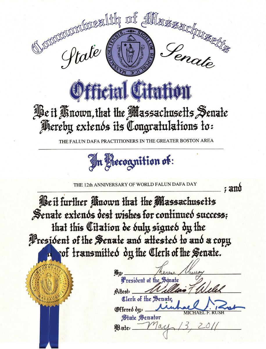 麻萨诸塞州参议院向新英格兰法轮大法学会致以最衷心的祝愿!