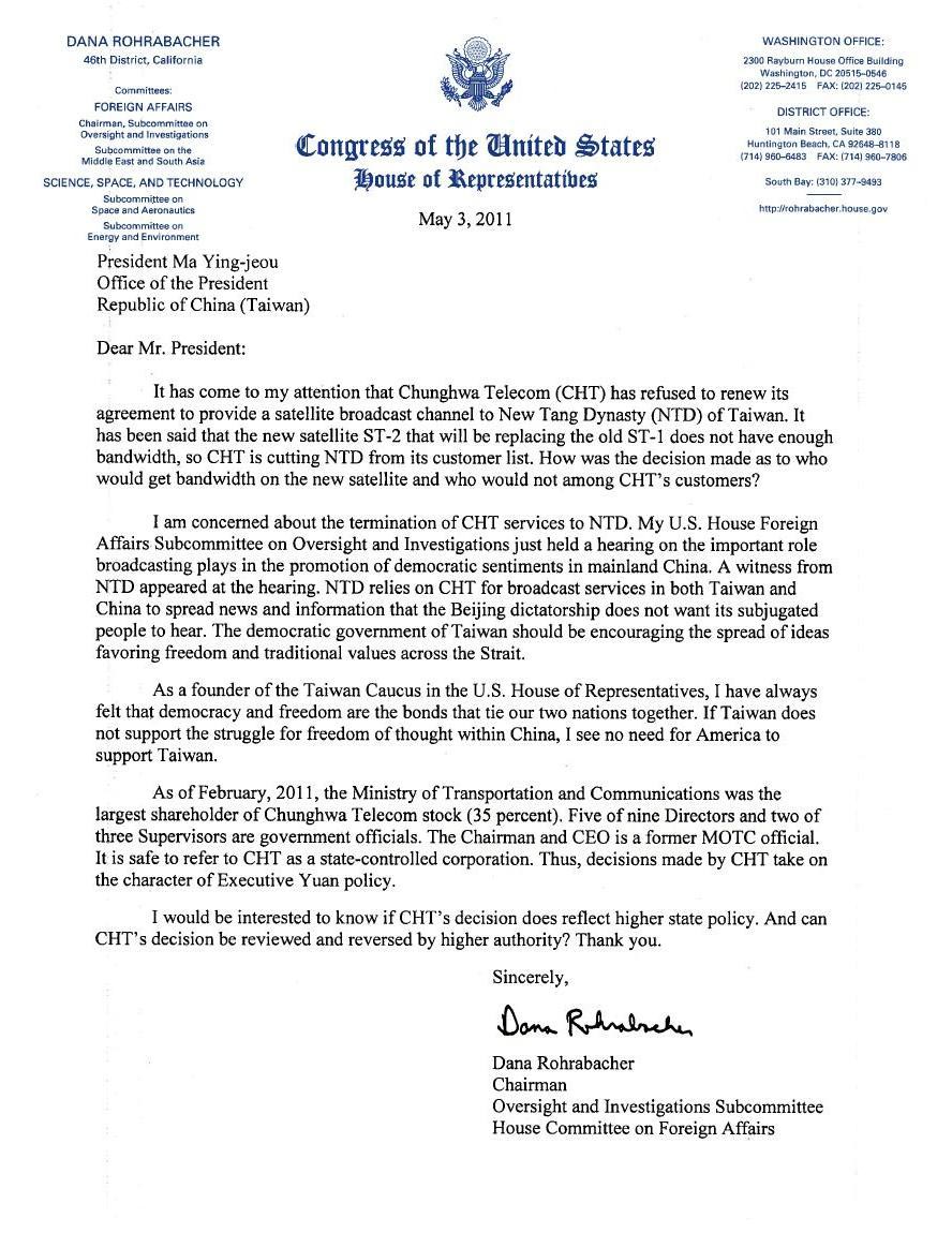美国国会民主党资深众议员、国际关系委员会分管美国外交政策监督和调查工作主席戴纳•罗拉巴克(Dana Rohrabacher)在五月三日“世界媒体自由日”当天发出一封给中华民国总统马英九的信函,主要针对台湾的电信龙头,中华电信旗下的国际电信分公司在四月中对新唐人亚太电视台表示今年八月卫星服务合约到期后不再续约,不提供新唐人亚太台“中新二号”卫星频道服务。罗拉巴克强烈质疑这个决定的背后动机。