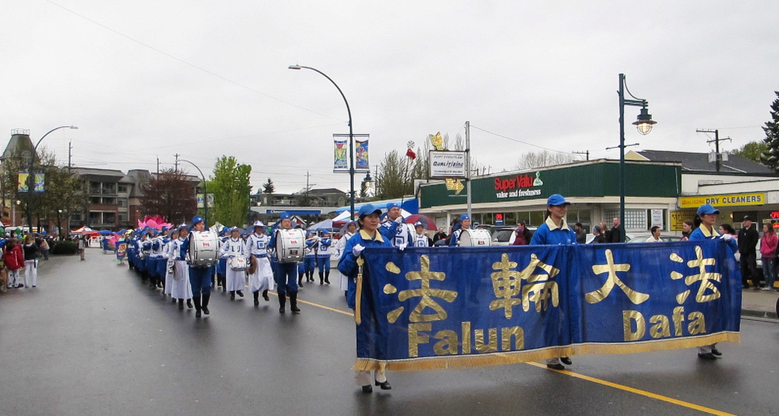 在上百个参加当日游行的团体中,法轮功团体的队伍最为壮观,天国乐团、演示功法的莲花花车、和腰鼓队齐上阵,博得沿途观众的一路掌声和摄像留影。