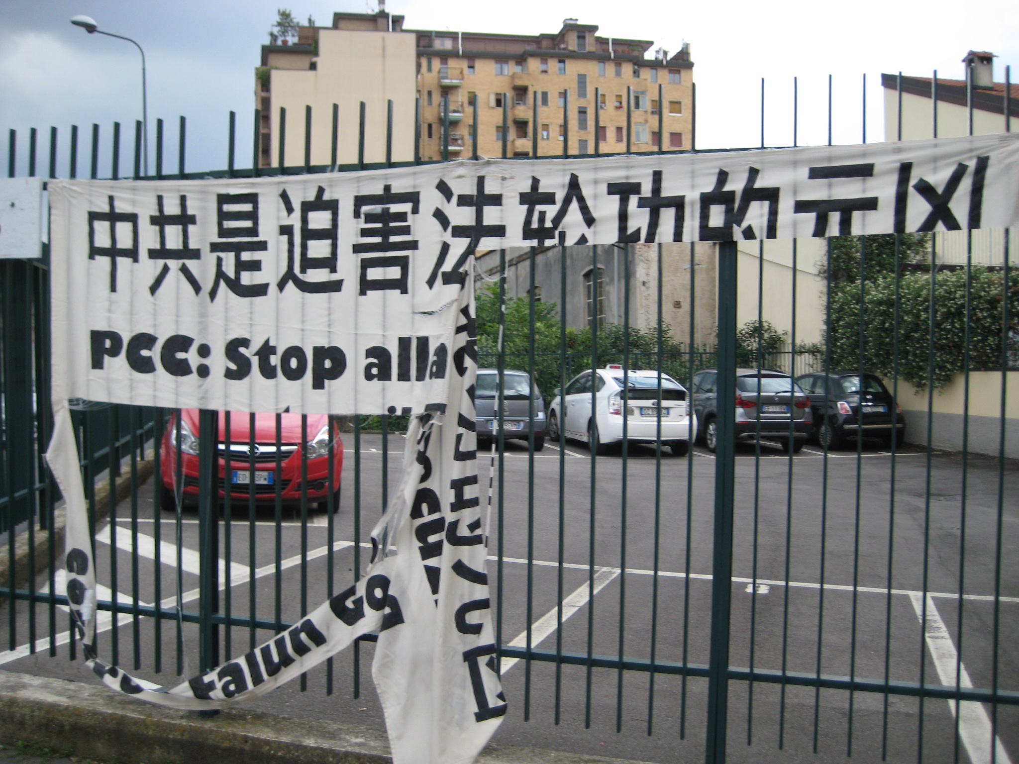【明慧网二零一一年六月二十二日】二零一一年六月八日,悬挂在米兰中领馆前的法轮功真相横幅和退出中共服务中心横幅被中共暴徒恶意破坏。遭破坏最严重的横幅是“中共是迫害法轮功的元凶”,还有两条写有“法轮大法好”和“天灭中共 退党自救”的横幅,绑绳一角也被扯下来了。