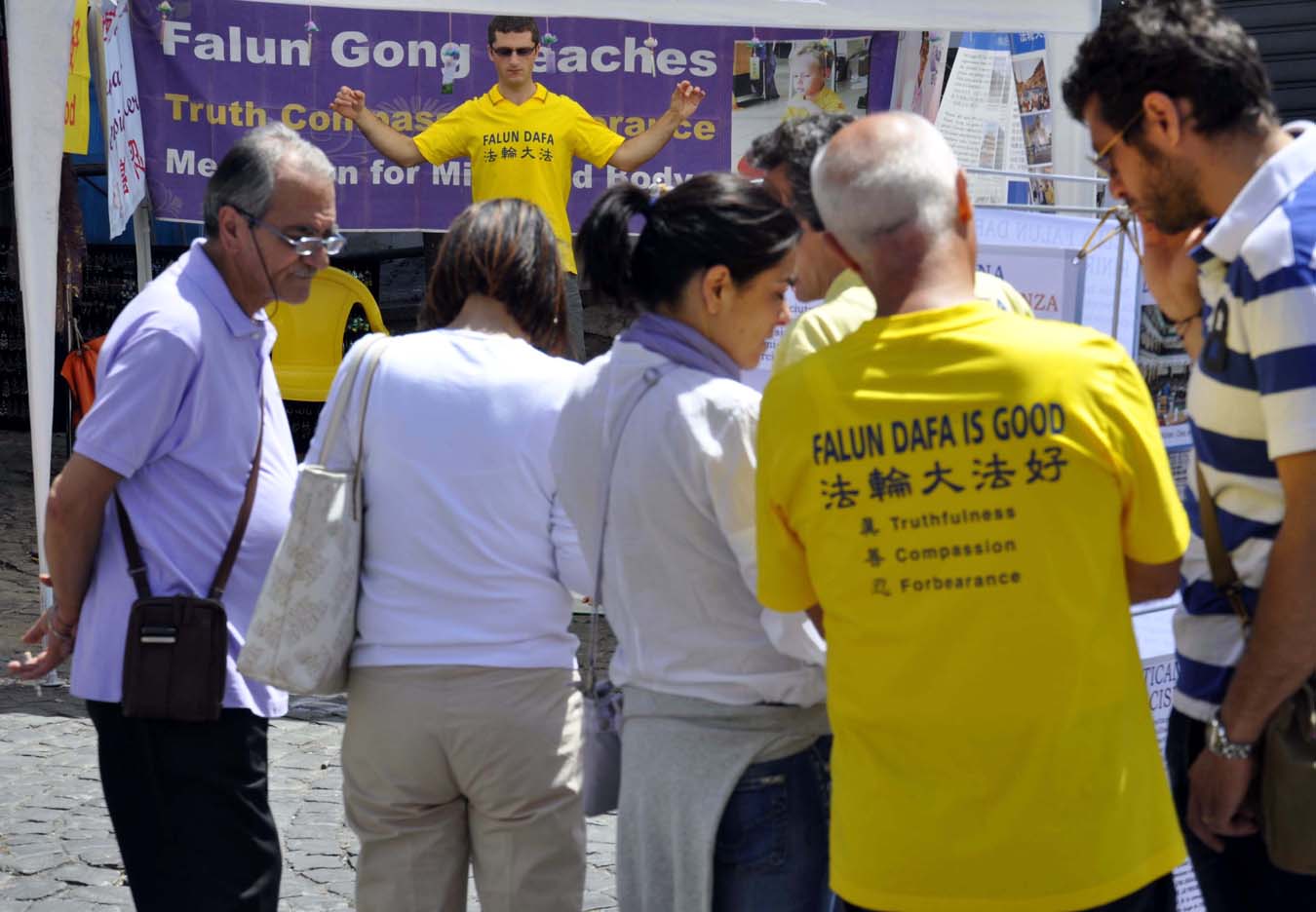 法轮功学员在真扎诺蒂罗马小镇的花节上讲真相