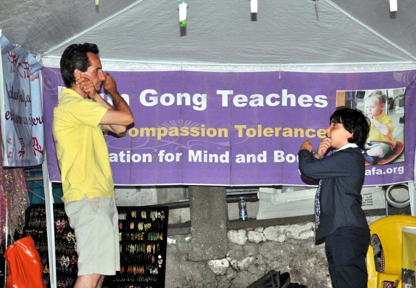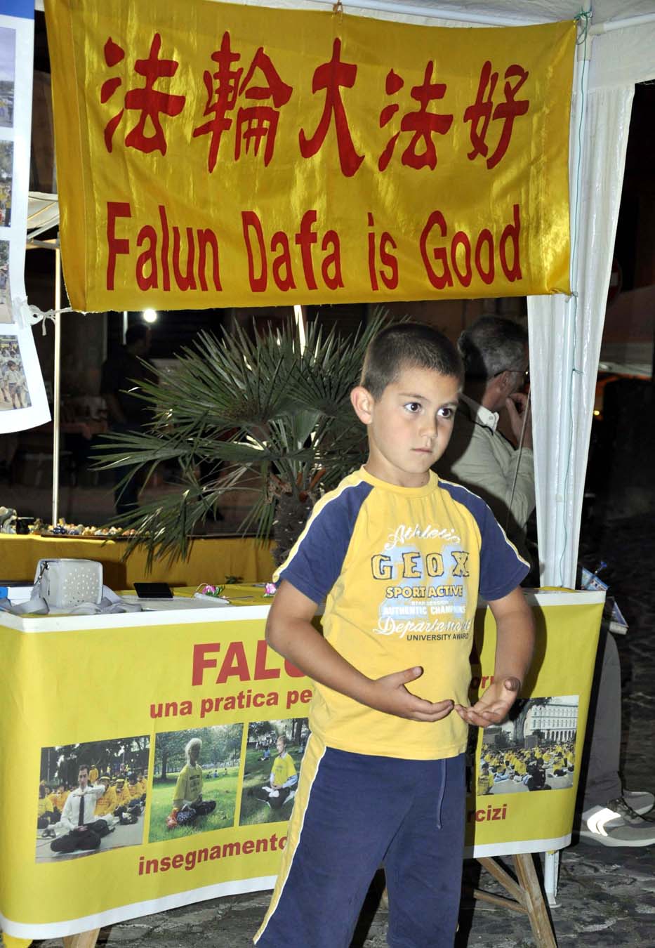 弗朗切斯科(Francesco)是一个八九岁的小男孩儿,周六晚上他跟父母来到法轮功真相展位。他们认真听了真相后,小弗朗切斯科说周日要来学炼功法。周日下午,小弗朗切斯科和父母果然又来了。由于学员当时无法教他功法,问他们能否一会儿再来。他便跟着父母去逛花街。傍晚时分父母准备带他回家时,他对父母说:我一定要再去法轮功展位,这是很重要的。他非常认真地学了前四套功法的每个动作,由于时间太晚了,他才恋恋不舍得地跟父母离开了展位。
