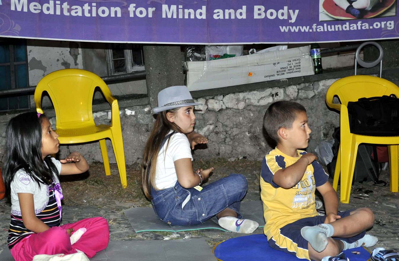 艾琳娜(左一)在和小朋友一起学法轮功第五套功法